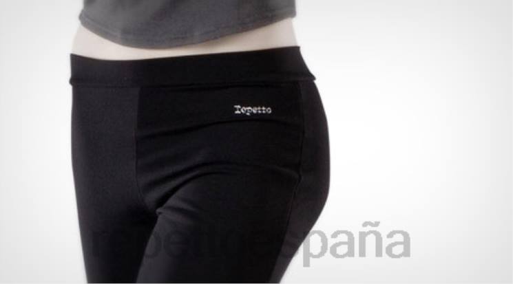 Pantalón negro con cintura cosida para joven bailarina. Transferencia transparente del logo de repetto en el frente.
